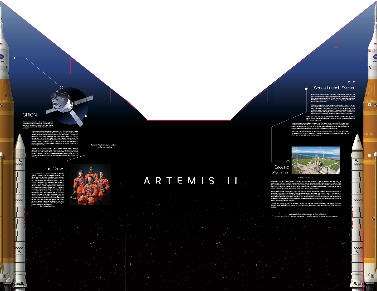 I created, from concept to proof, a new exhibit for outreach from NASA JSC. The requirements were an exhibit that could stand alone, engage an audience, or be cohesive with other NASA materials at a trade show-type event. Physically It needed to be practical in terms of setup for schools, libraries, or other places that might not have outreach/setup teams. Created in Adobe Illustrator, InDesign, and Photoshop. August 2025.