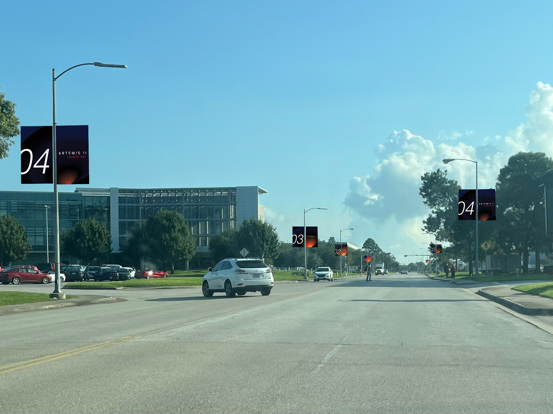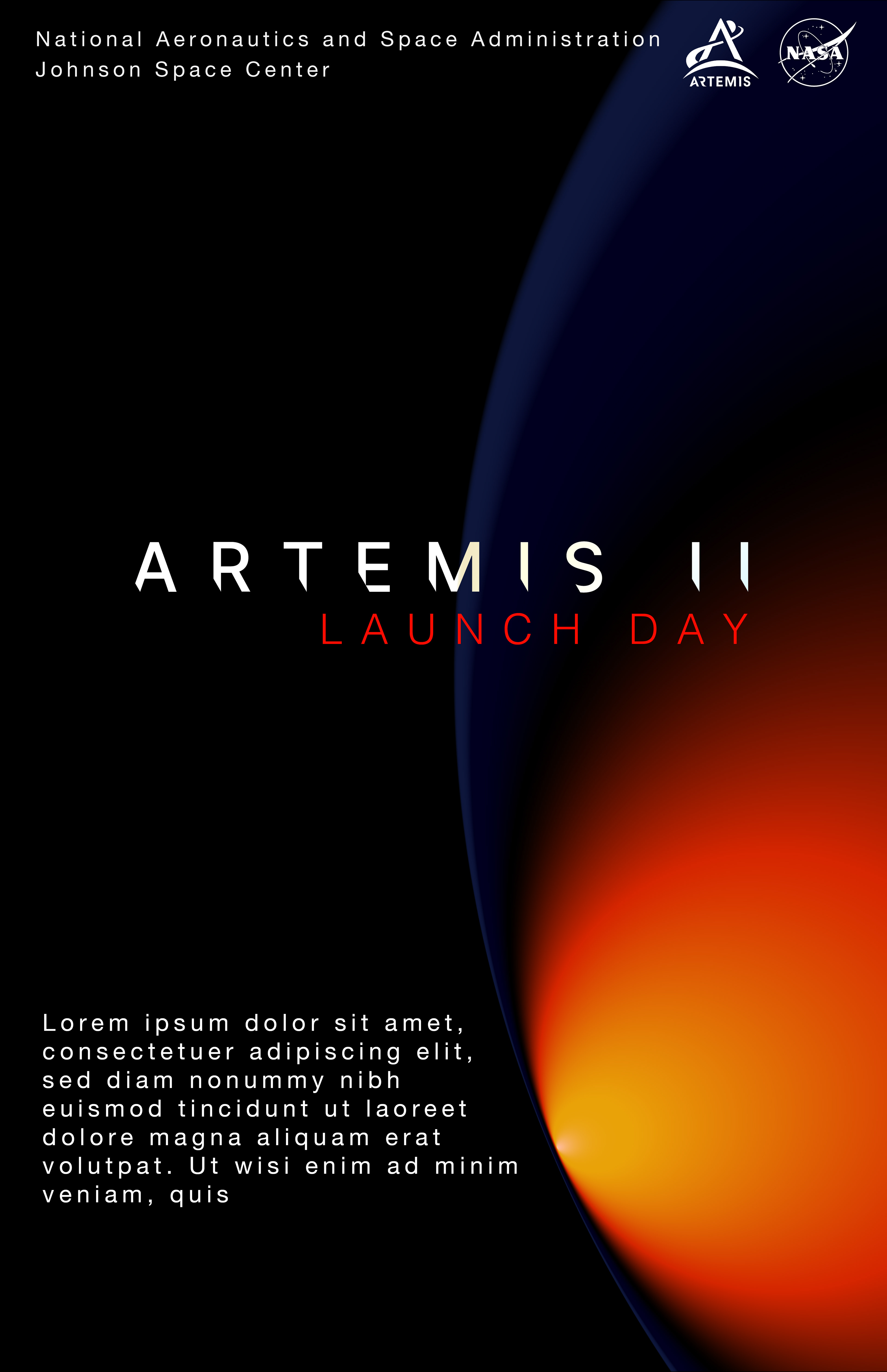 Created concept art to start gearing up for Launch day at NASA JSC. While KSC (Florida) has the launch pad itself, JSC (Houston) is home to mission control and hosts mission-critical flight operations and engineering. Working within NASA's current guidelines and promotional materials, I worked within the exhibits team, helping establish what JSC's visuals and materials would look like for the launch day. Created in Illustrator and Photoshop. August 2025.